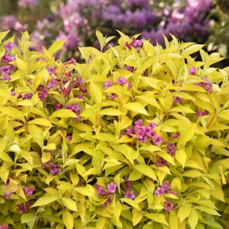 Perhaps the brightest weigela yet, this exciting new shrub shines with brilliant golden leaves that hold their color all season long, undaunted by summer sun. Prolific crimson buds open to deep pink blooms and last for nearly a month.