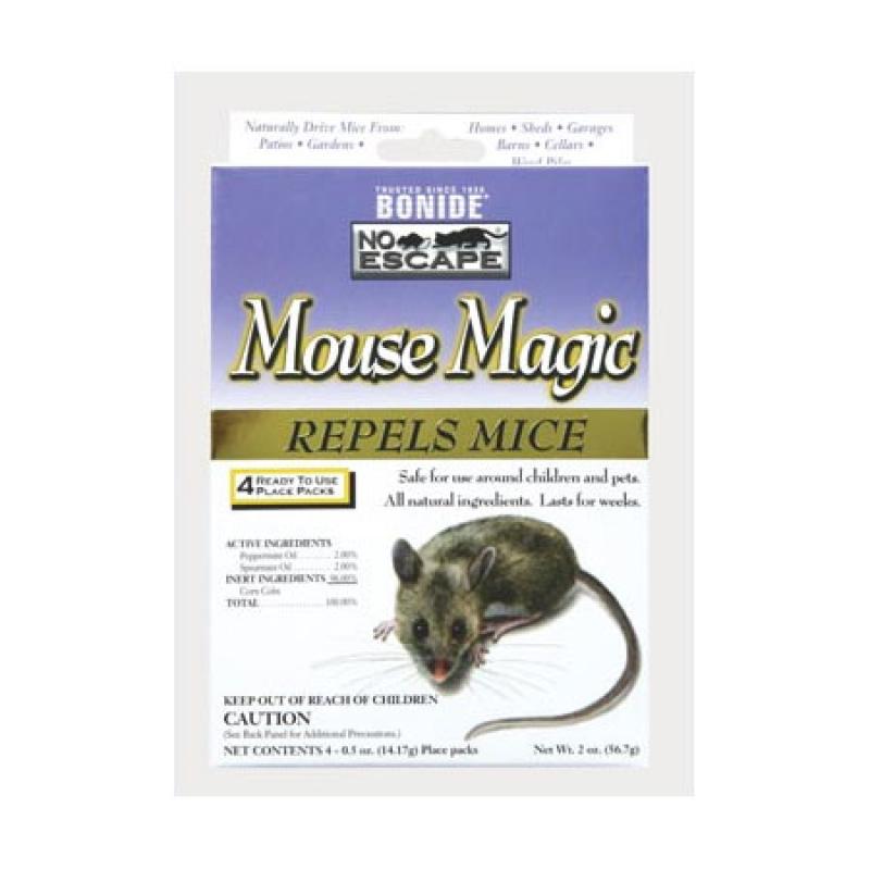 All natural ingredients triggers "escape/avoidance" behaviors in mice driving them from homes, sheds, patios and more. Simply locate "place packs", which exude the repelling quality of the essential oils, anywhere mice enter, feed or nest.