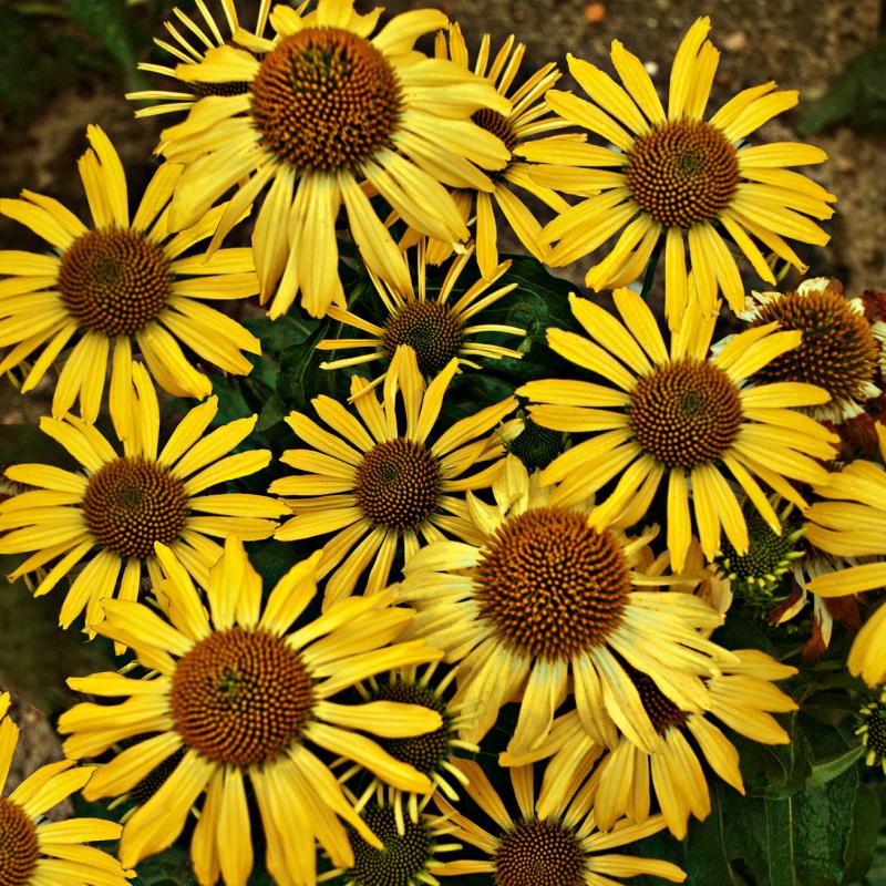 The cheery, yellow, 3.5" flowers of this variety have prominent orange-brown cones and appear from July to September on a stocky, well branched plants.
