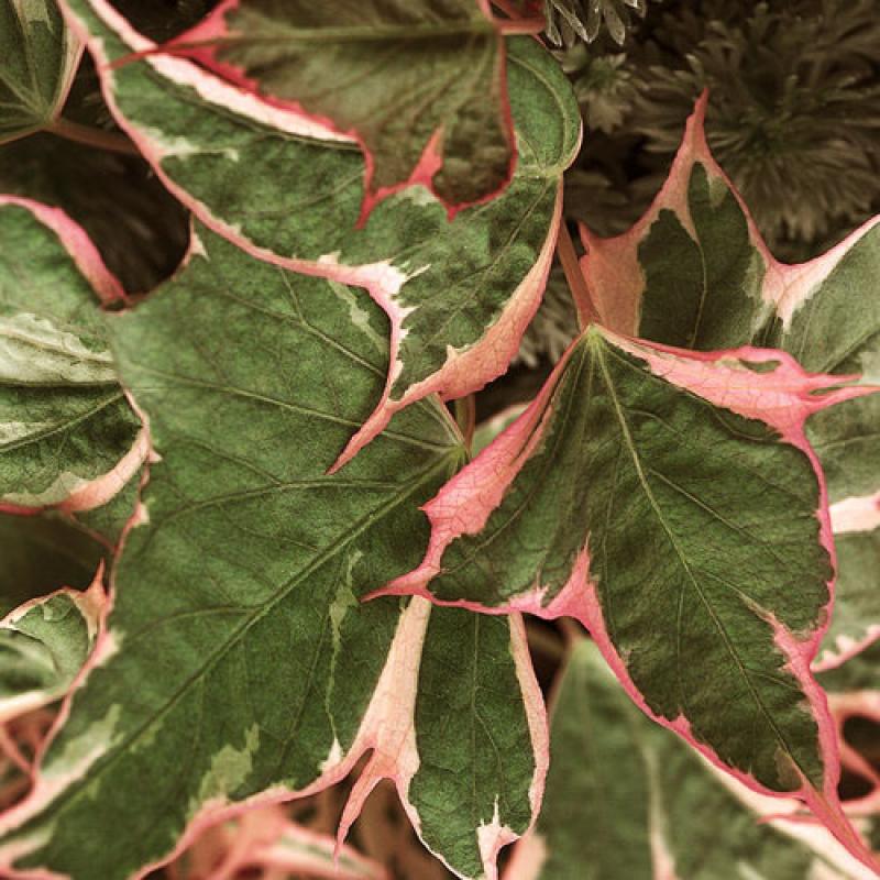 An excellent trailing foliage accent with deep green leaves irregularly edged in bright pink, light pink and cream. Thrives in part sun to full sun areas.