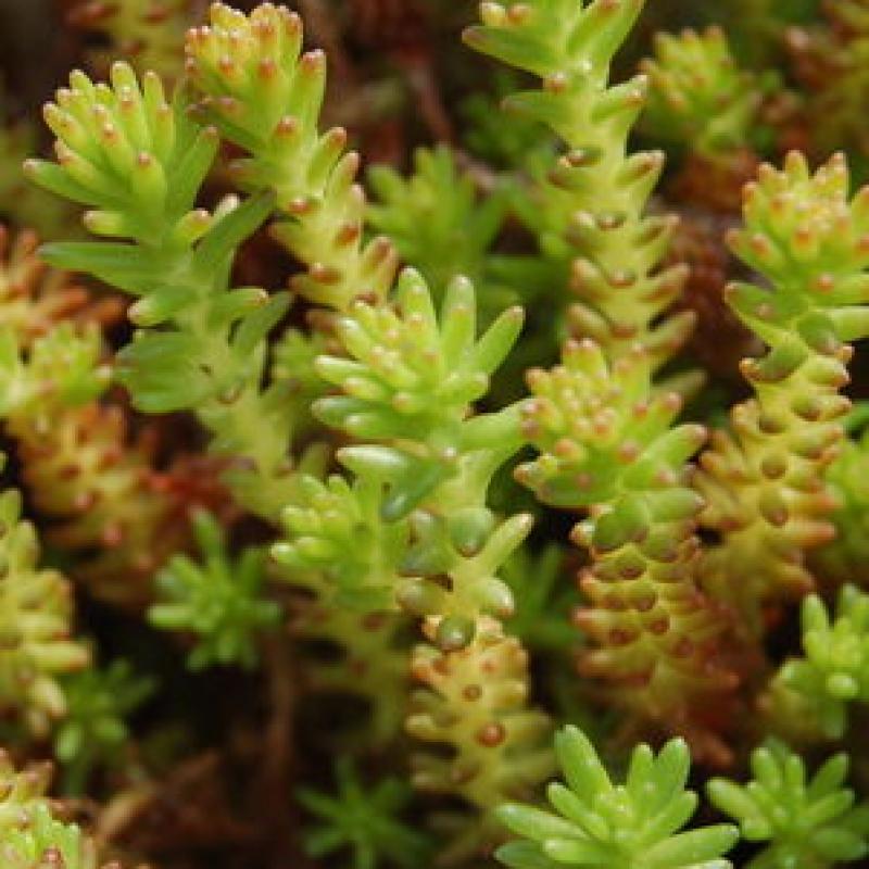 'Aureum' is a diminutive, pale green, spreading Stonecrop with bright yellow growth in spring. It blooms during early June with tiny yellow flowers that lend it the appearance of a golden moss.