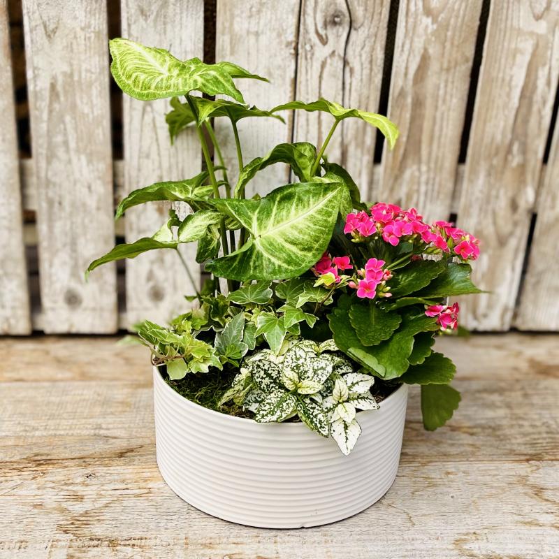 Bring color and texture indoors with this dish garden that features a seasonal flowering plant and plenty of wonderful foliage houseplants.