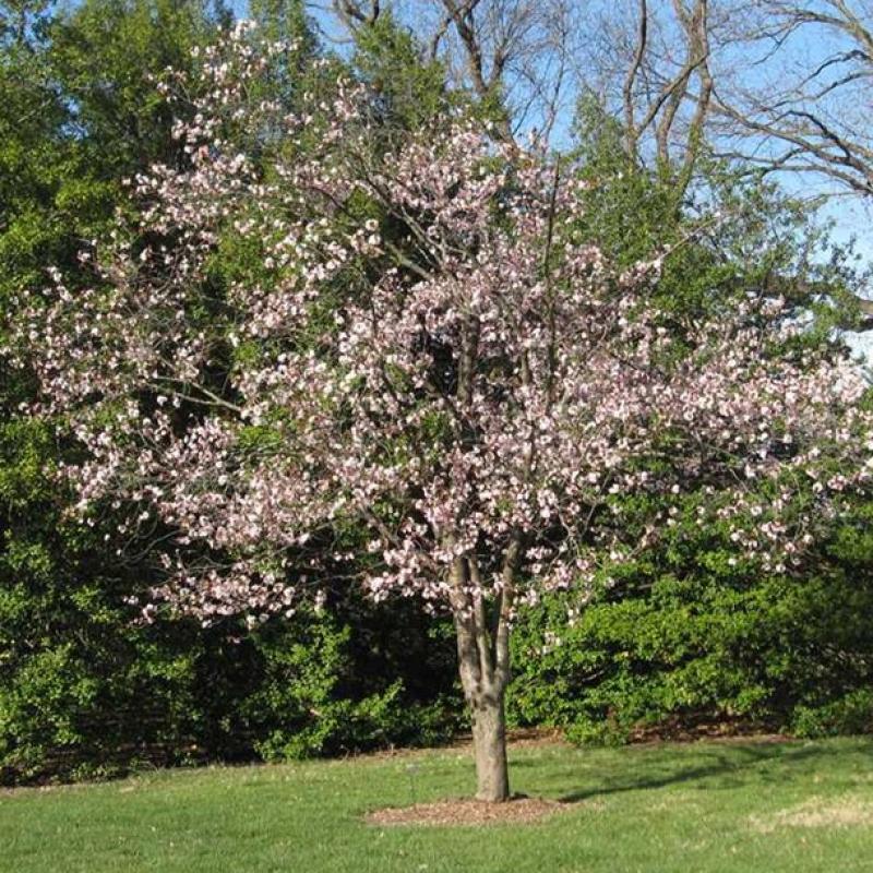 A lovely tree with masses of single, light pink flowers in late April to early May and leaves that emerge bronze-green before maturing to a deep green. The bark is heavily lenticeled and offers a rich red-mahogany color with a beautiful sheen.