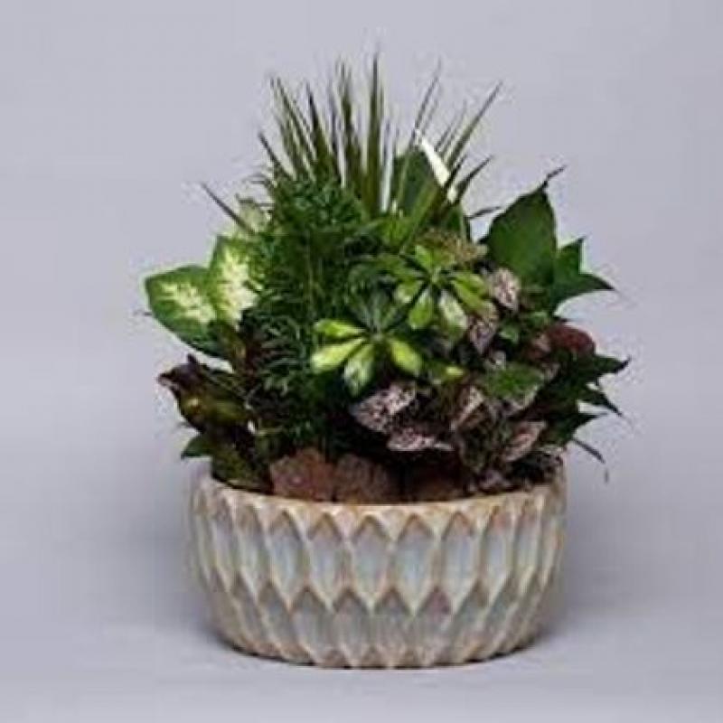 Enjoy the beauty of greenery indoors all year round with our Mixed Green Foliage Dish Garden in a decorative pot, or gift it to a friend to brighten up their space!