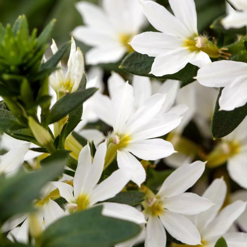 Pure white, fan-shaped blooms with soft yellow centers create a clean, elegant trailing display. This vigorous, heat-tolerant variety flowers continuously without deadheading and performs beautifully all summer.