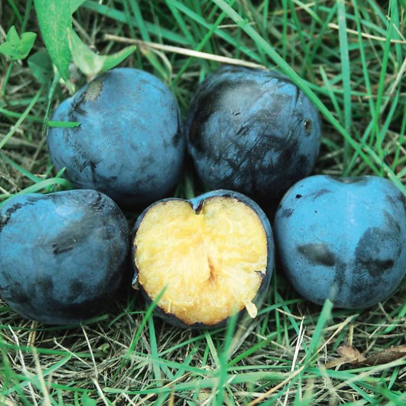 A semi-dwarf, self-pollinating variety that is very hardy, 'Mount Royal' will produce medium-sized, juicy fruit that has a blue skin, yellow clingstone flesh and ripens in late August.