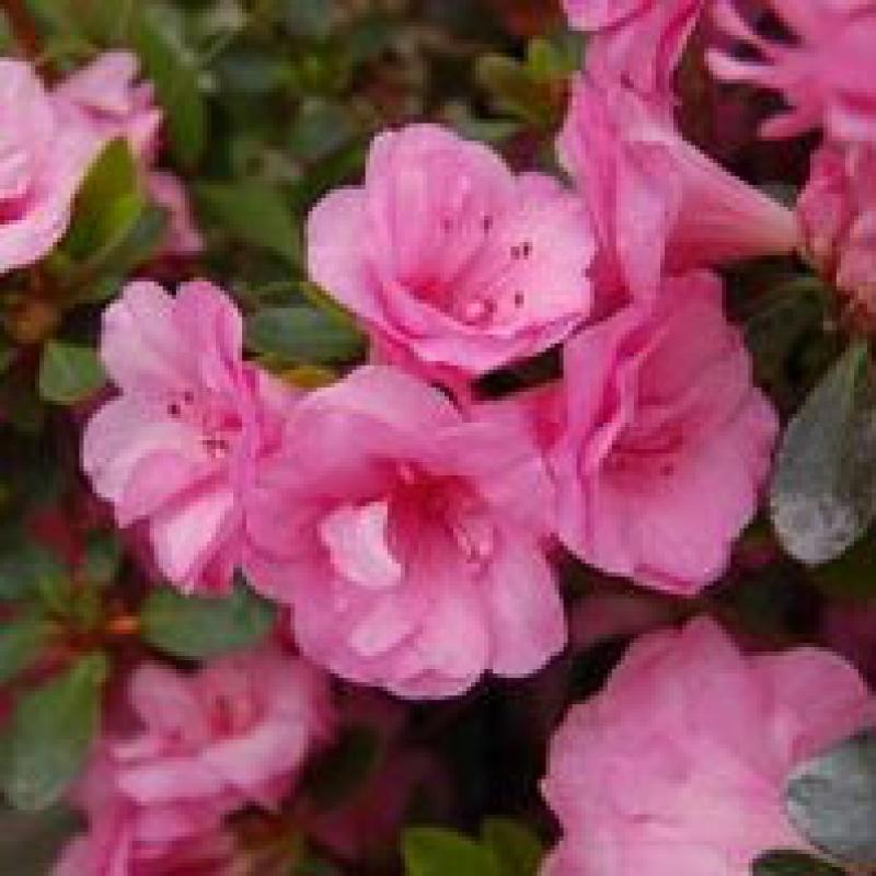 Beautiful, fully double, rose-pink flowers appear in May over small, glossy, dark green foliage that's semi-evergreen on this dense, low growing plant.