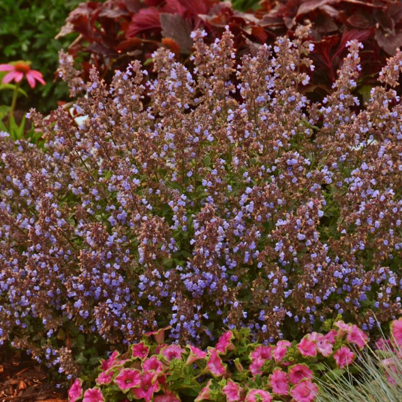 'Purrsian Blue' creates compact, aromatic mounds of soft gray-green foliage that make way for an incredibly large number of periwinkle blue flowers on delicate stems. It will bloom continuously from June to September.