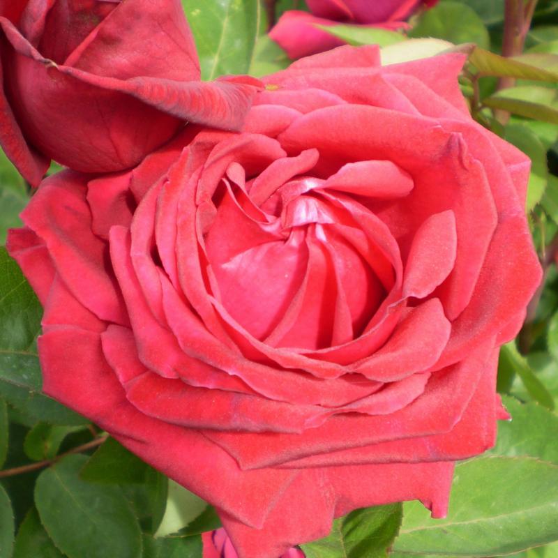 'Kashmir' sports large, hybrid tea-like, deep red buds that rise above deep green, disease resistant foliage and open to fat, heavily petaled, 3" diameter, dark velvety-red flowers from late June until frost.