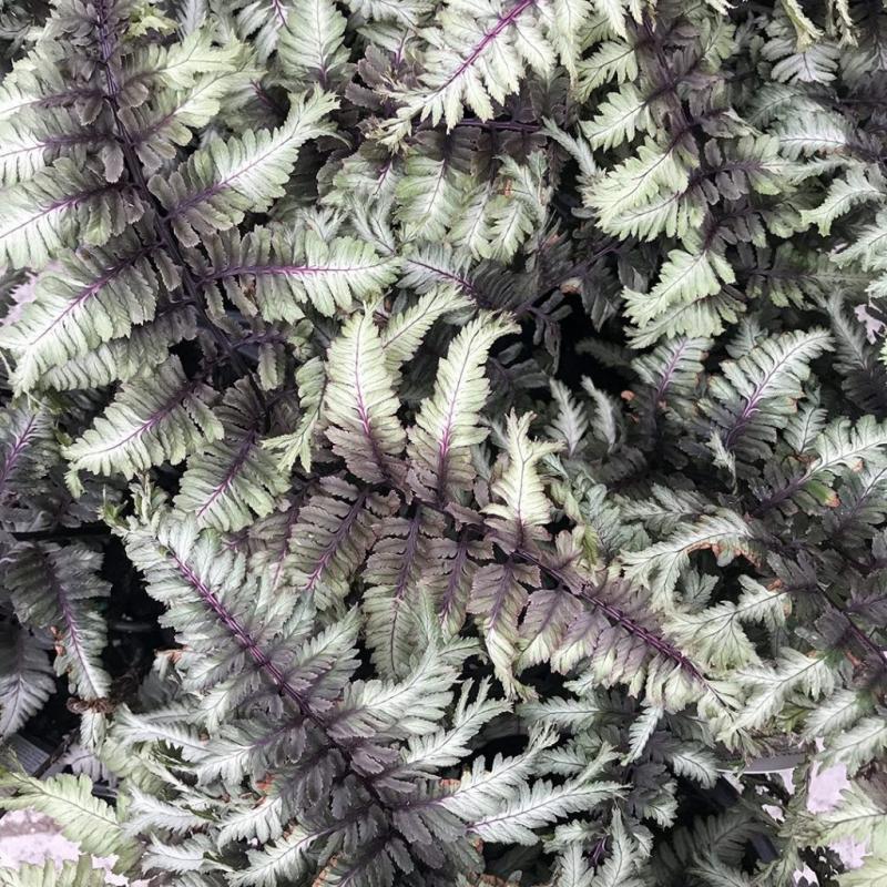 Elegant silver fronds with deep burgundy stems and finely crested tips create a lush, textural display in shade gardens. A standout among ferns, with a tidy clumping habit and deer resistance.