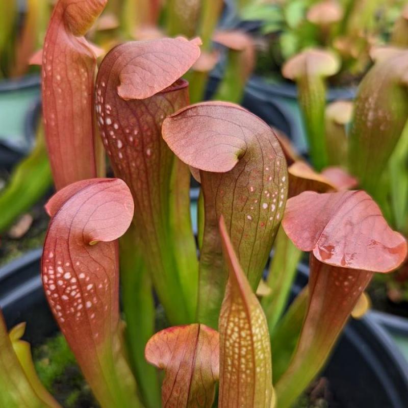 An eye-catching carnivorous plant with upright, red-tinted pitchers and white “window” spots that lure insects. 'Bug Bat' is compact, easy to grow in bright light, and thrives in bog-like conditions—perfect for adding curiosity and function to your indoor plant collection.