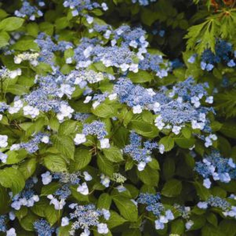 'Blue Billow' features delicate, light blue, lace-cap flowers that last for several weeks in early to midsummer before turning a warm red-burgundy as they age. The deep green foliage has a thick texture and turns an attractive shade of burgundy in fall.