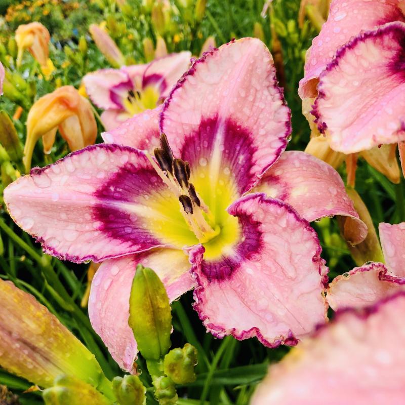 A fragrant rebloomer that is also drought and salt tolerant, this variety offers 6" triangular-shaped peach flowers with a wine purple eye. The purple color blends to lavender purple like watercolor paint toward the yellow throat for a stunning display.