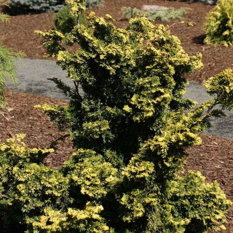 The lovely chartreuse new growth of 'Golden Nymph' turns to yellow as it matures on this charmingly compact irregularly upright miniature.