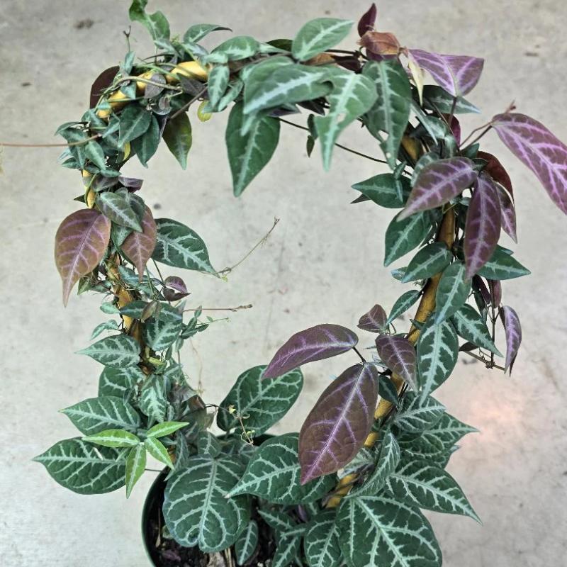 A striking vining houseplant featuring silver-veined green leaves that mature into deep violet-purple hues. Trained onto a hoop or trellis, it makes a dramatic statement indoors with its bold coloring and climbing habit.