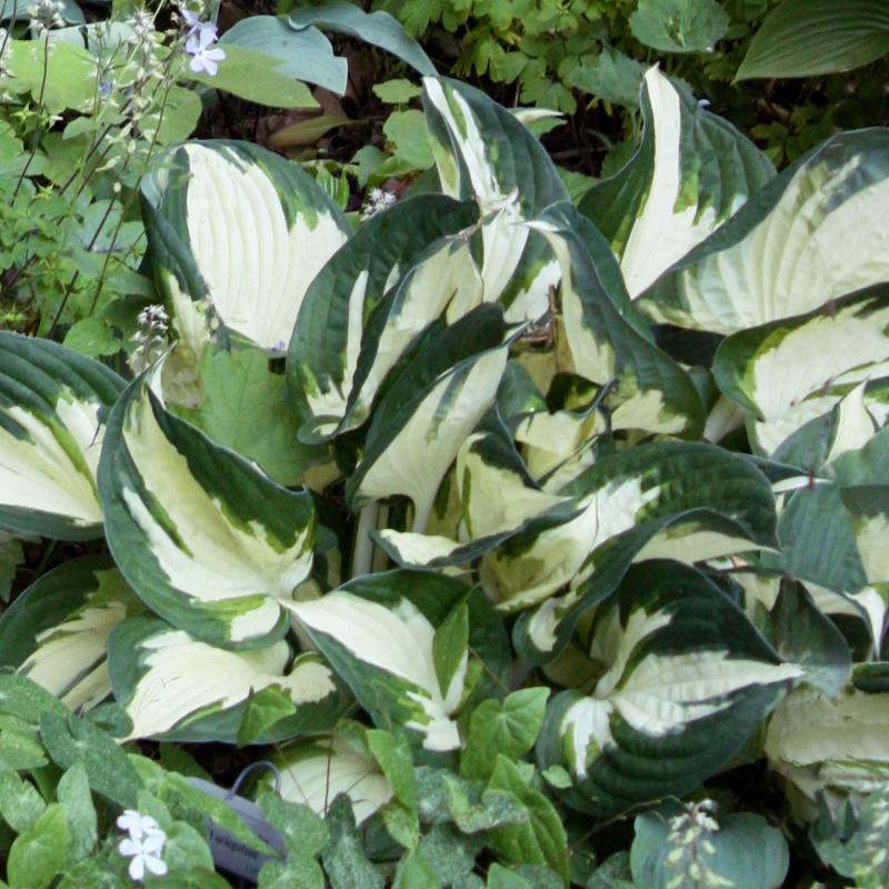 The leaves of 'Fire and Ice' have a heavy substance and a slight twist that creates a sense of movement and draws your eye to their pure white centers and dark green edging. Lavender flowers that appear in July will complete the look.