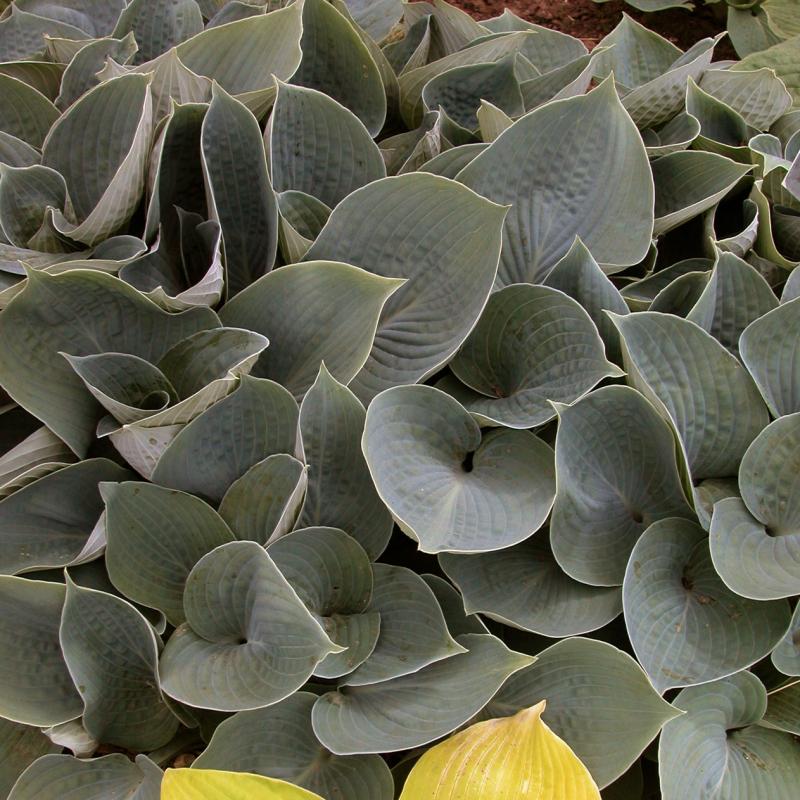 Light lavender blooms emerge on this medium-sized plant that features powdery steel-blue, heart-shaped leaves with a puckered texture.
