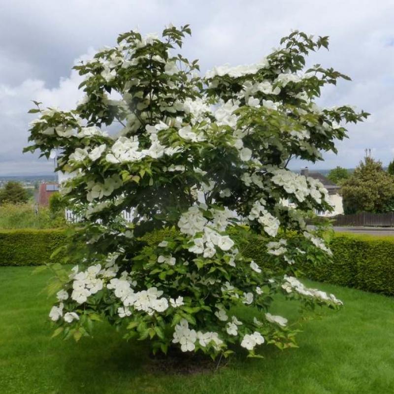 An exceptional hybrid dogwood known for its enormous, pure white bracts that appear in late spring. Vigorous, disease-resistant, and upright, with handsome layered branching and excellent landscape presence.