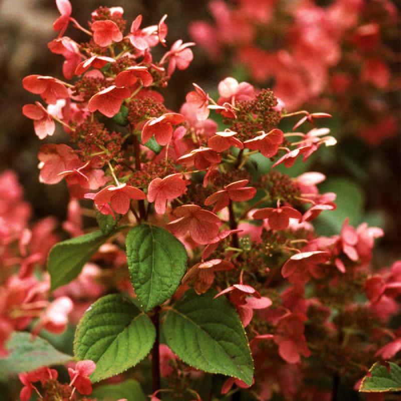 'Quick Fire' will produce white blossoms about a month before other hydrangeas and then turn a deep rosy-pink in the fall. Deep green foliage held on deep red stems completes the look.