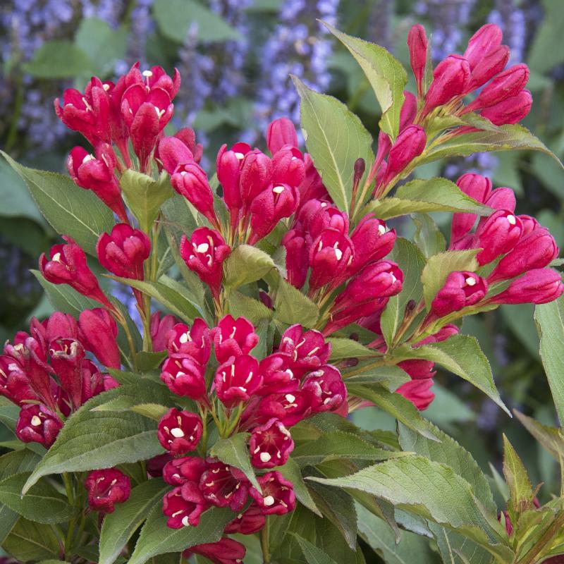 'Crimson Kisses' is a more compact reblooming Weigela with a tidy, rounded shape that will be covered in June with bright, lipstick-red flowers with a white eye.