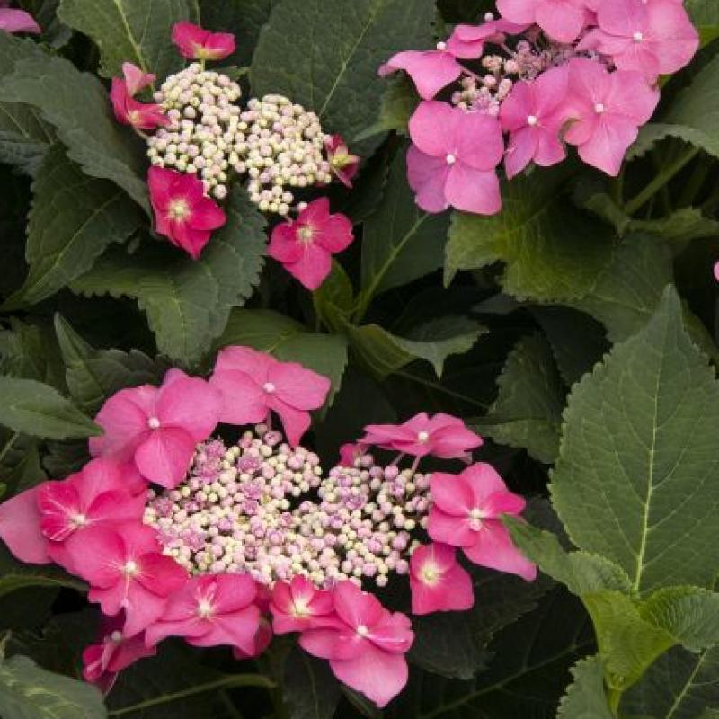 Perfect for borders, this compact Mountain Hydrangea displays very large lacecap blooms on strong, extra thick stems. The flowers will be blue in acidic soils and pink in neutral to alkaline soils. Serrated leaves may show touches of red with age.