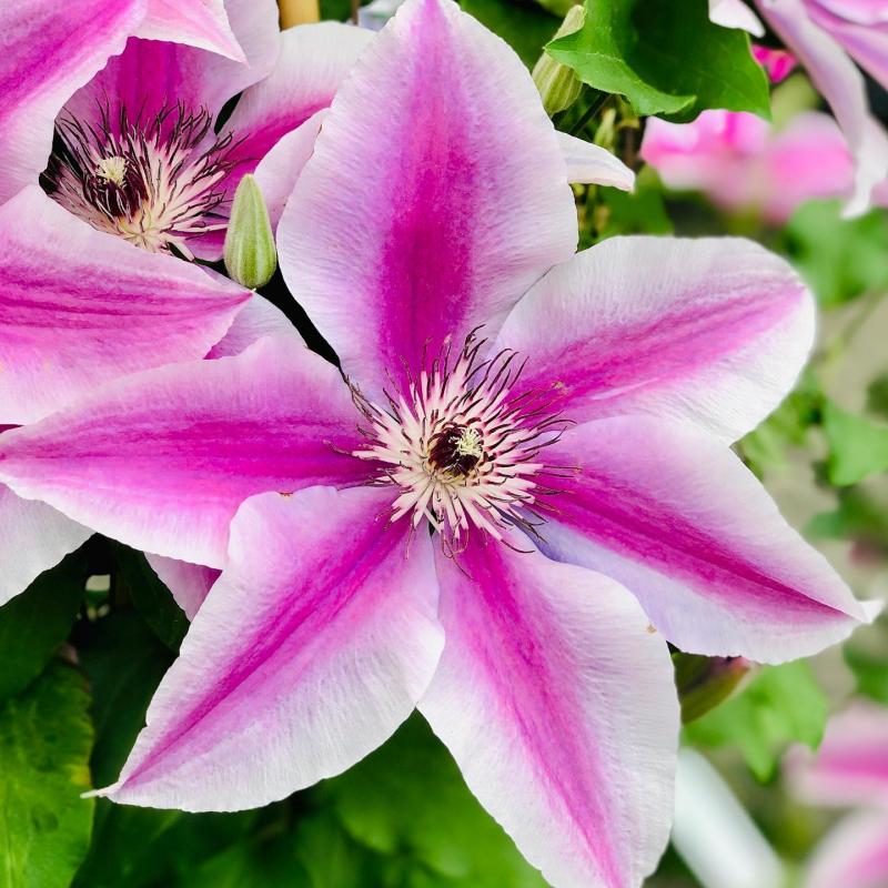 A profusion of large, sensational flowers will bloom continuously on this sturdy, compact climber over a long season. Each pink flower petal features white margins and a contrasting burgundy midrib. (Pruning Group 3)