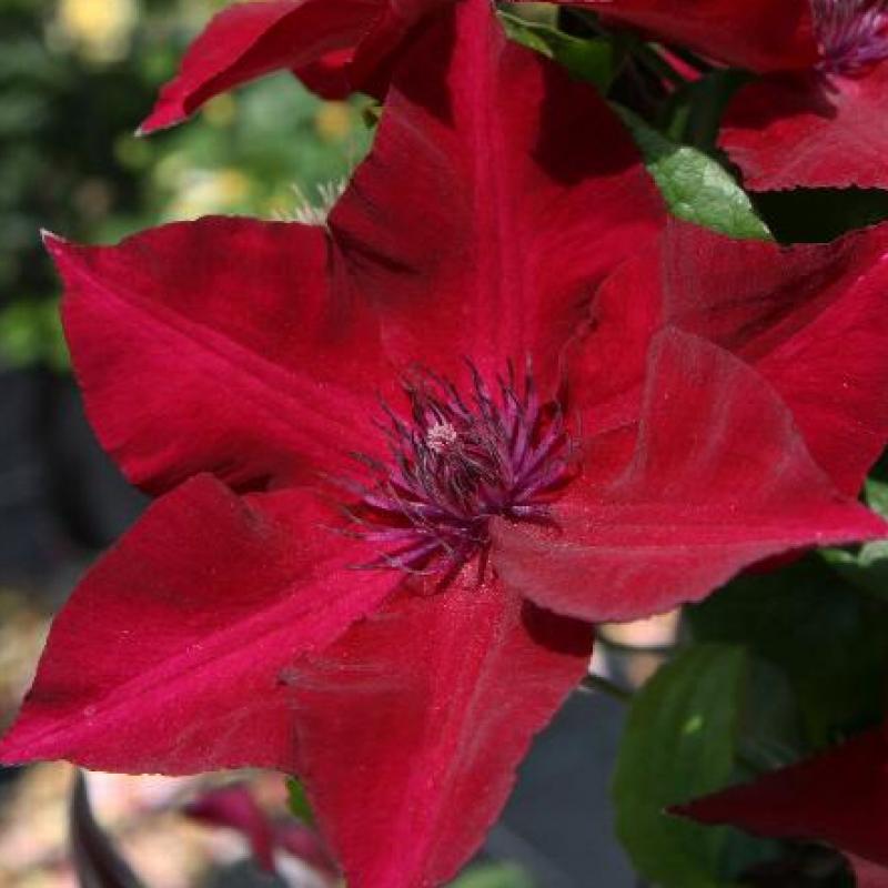 'Nubia' features deep red flowers with purple stamens that will bloom from the bottom to the top, an improvement over other varieties. The flowers appear heavily in June with repeating until September. (Pruning Group 3)