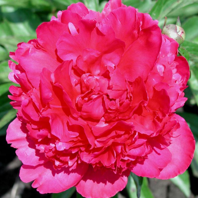 Large, double, fragrant, 5-7" deep raspberry red flowers are produced abundantly in mid to late season over dark green, thick and glossy foliage.
