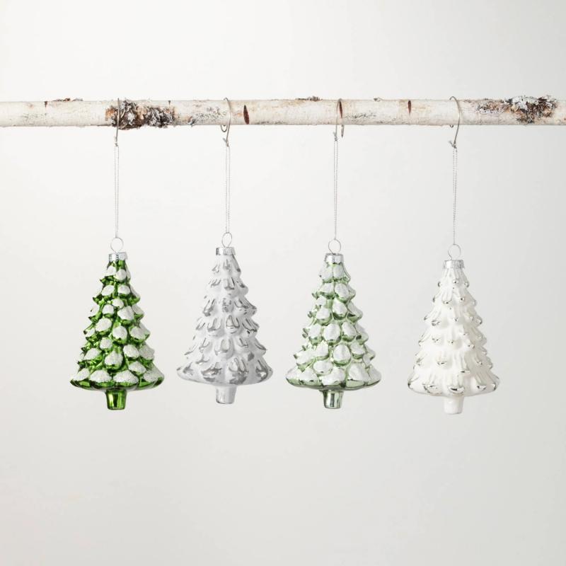 Create a winter wonderland with these snowy glass pine tree ornaments. Four color combinations, with the green trees sprinkled with glitter.