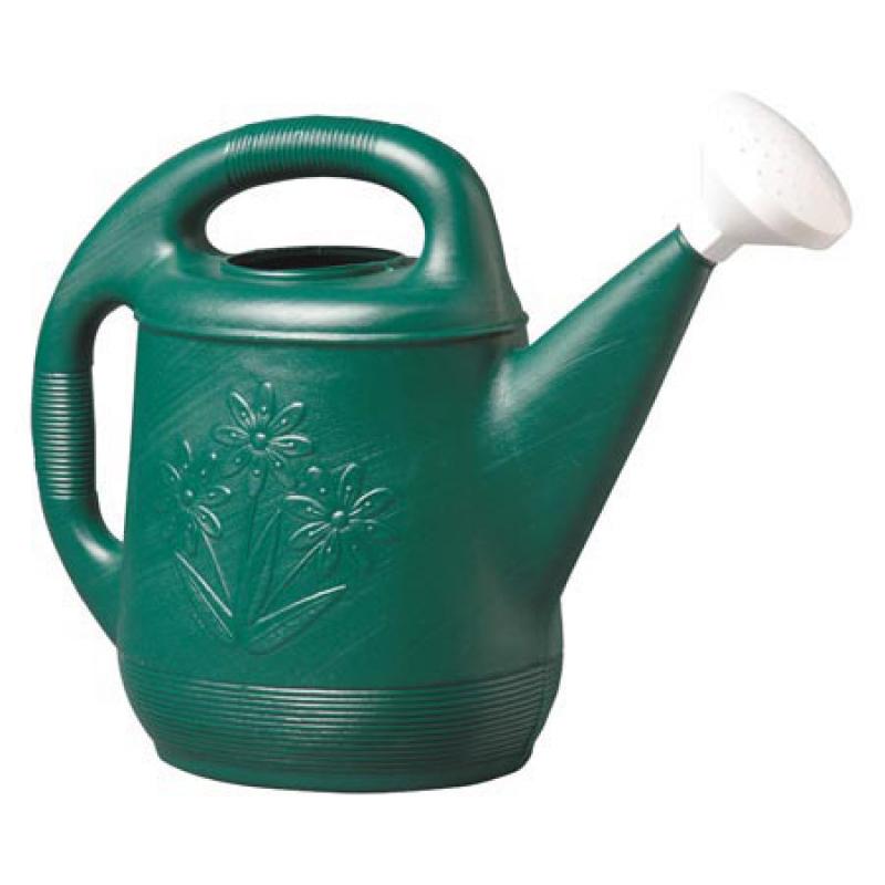 Durable plastic 2 gallon, green watering can with floral design.