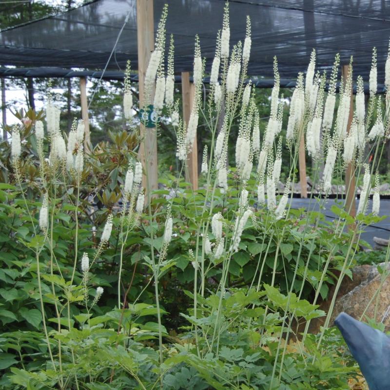 Tall, airy wands of small white flowers that look like delicate forest candles appear amid the dark green, heavily textured basal foliage of this striking selection.