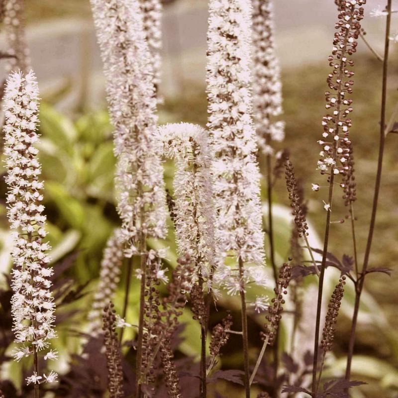 The darkest Actaea to date! The striking dark purplish-black foliage and fragrant, white bottlebrush flowers that grow up to a foot long with a pale blush pink tinge make this a true collector's item.