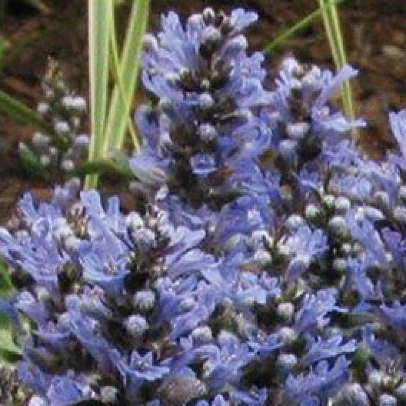 A new selection of Bugleweed from Europe, 'Chocolate Chip' features unusually narrow foliage that is dark green and overlaid with purple. It creates a very low mound and gives rise to short spikes of showy blue-purple flowers in spring.
