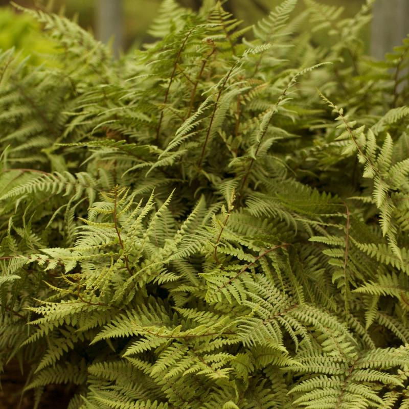 This fern is a cross between Lady Fern and Japanese Painted Fern. A beautiful, clump forming, rigidly upright fern, 'Ghost' features unique silver-gray foliage and can be planted anywhere in the shade garden - even in rather dry conditions.