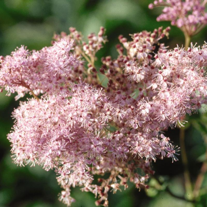 Masses of cloud-like, peach-pink flowers appear in June to July on plants that spread quickly by underground runners.