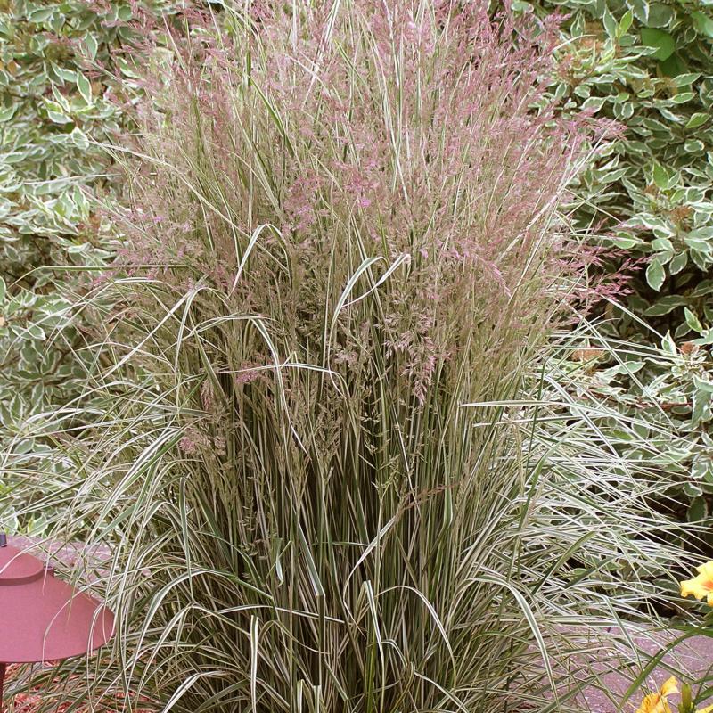 Variegated with white and pink edged erect leaves in compact clumps, 'Overdam' will produce pink to white plumes in June.