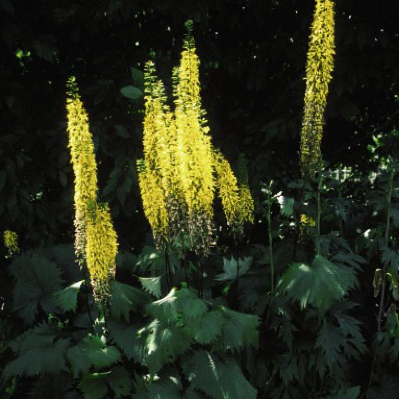 'The Rocket' produces spikes of golden yellow flowers that appear in July on tall black stems amid interesting dark green, maple-shaped leaves that have long toothed serrations.