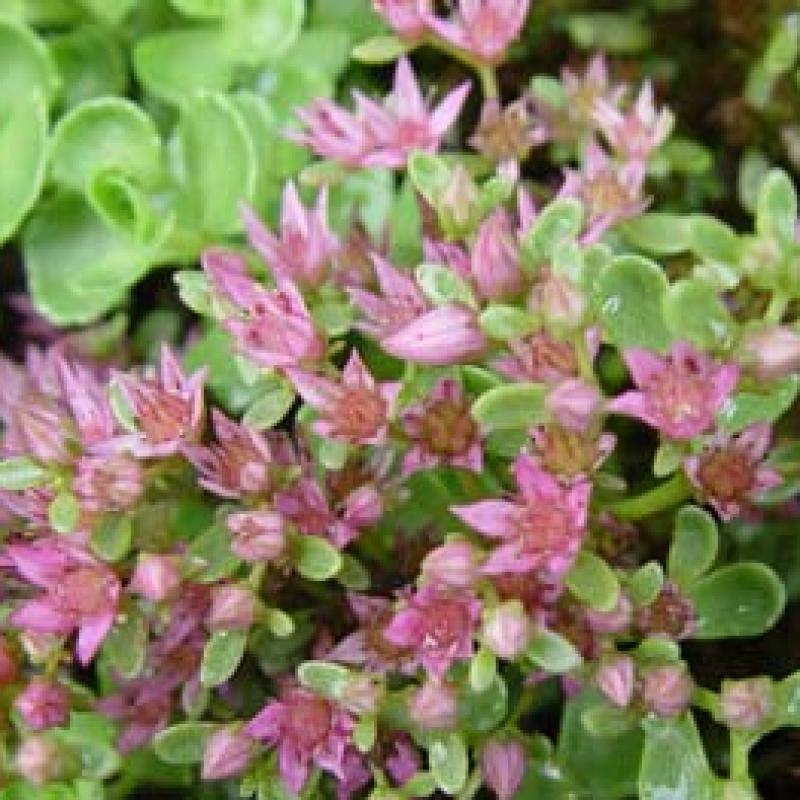 'John Creech' is a very low, mat-forming selection with rounded, deep green leaves, that serve as a backdrop to small clusters of mauve-pink starry flowers in late August.