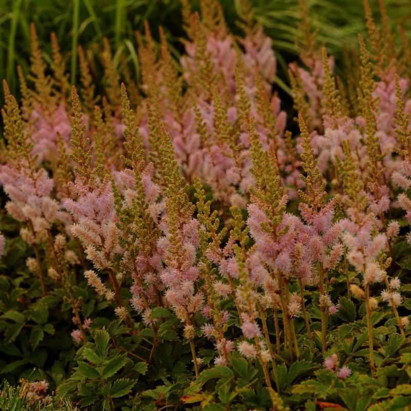 Lavender-pink flowers emerge in late July to early August on this dwarf creeping plant that will tolerate more sun than most Astilbe varieties as well as drier soils. 'Pumila' is a good choice for a groundcover in dry and shady conditions.