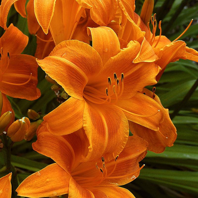 'Rocket City' produces 6" glowing orange flowers with lighter midribs, a glowing yellow throat and crimped, recurved petals. The flowers bloom in July and stay open for 16 hours at a time.
