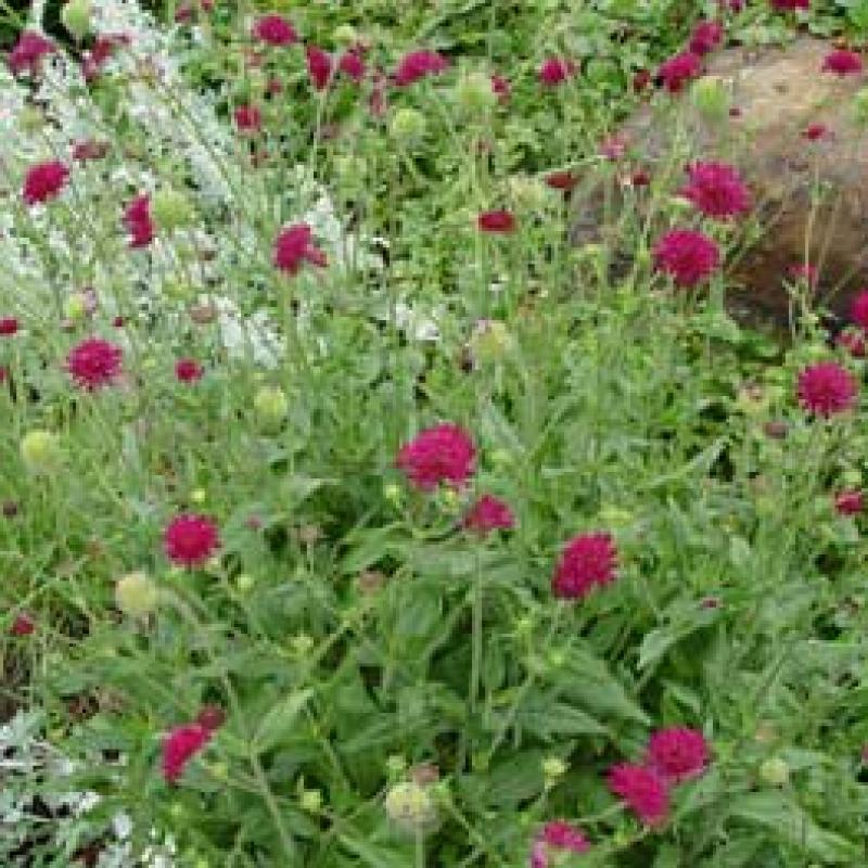 This selection produces maroon to brown-maroon flowers similar to Scabiosa all summer that are held on wiry stems above deeply cut, basal, slightly hairy foliage.