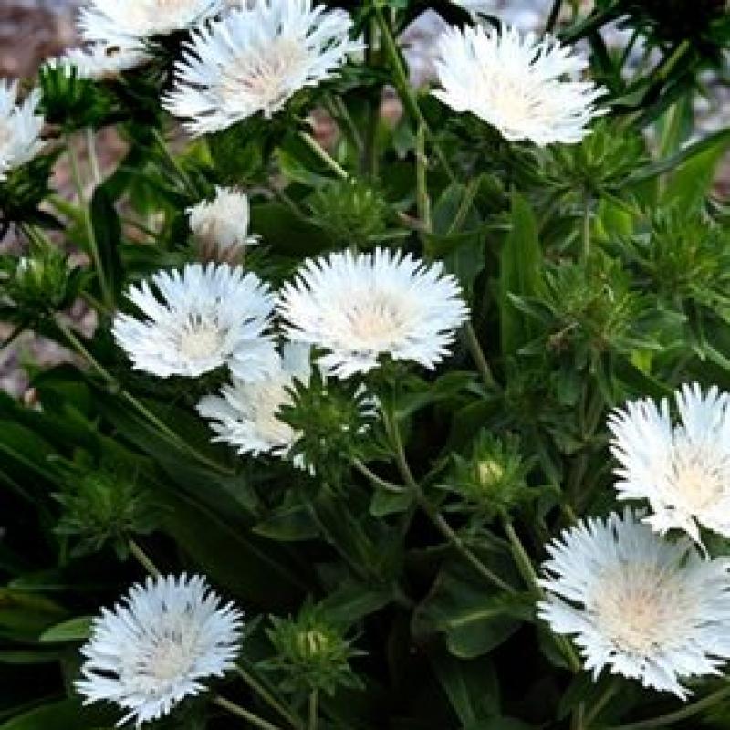 The large white flowers of this variety open with a hint of yellow in the center before maturing to clear white. The blooms hover over neat mounds of broad, deep green, strap-like leaves during late July and August.