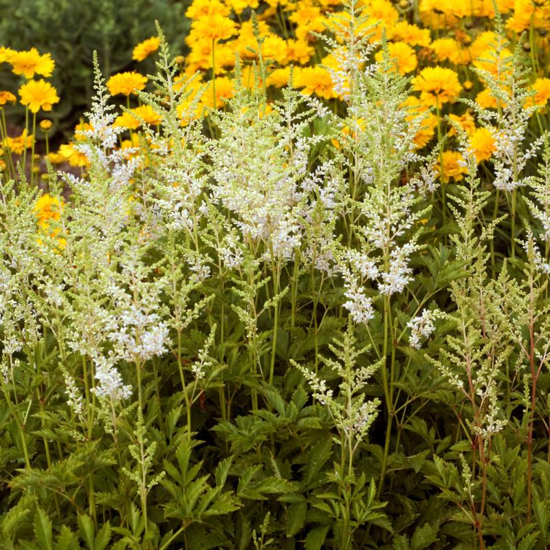The fluffy white blooms of 'Snowdrift' emerge in July over light green foliage.
