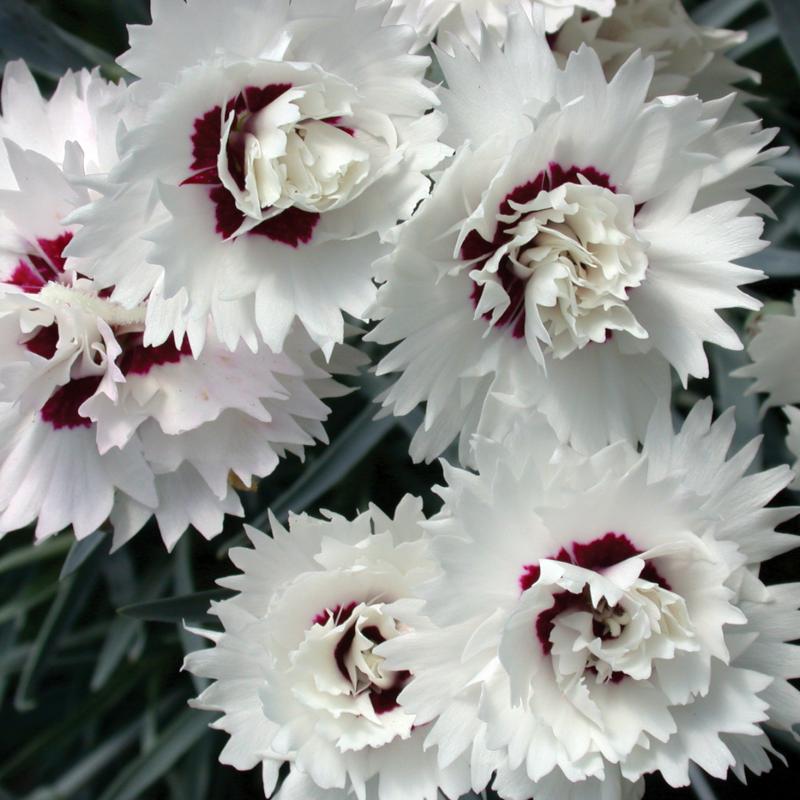Featuring semi-double, pure white flowers with a maroon eye, fringed petals and a sweet fragrance, this variety is a fantastic choice. The frosty gray foliage is really striking and sets off the flowers beautifully. Blooms from late June through July.