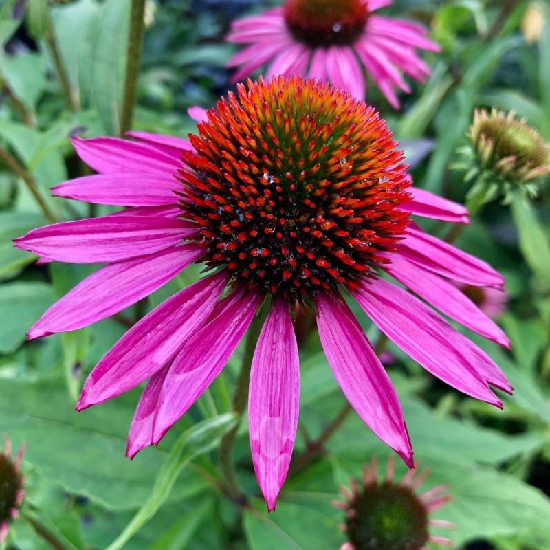 A unique form with 3" quilled, mauve-pink petals held flat and surrounding a large orange cone, 'Pica Bella' will bloom from July to September on mid-height plants.