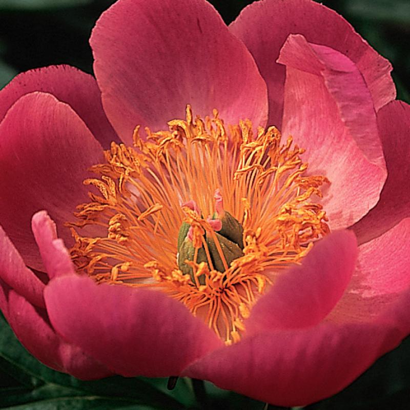 'Paramount' will produce single flowers in late May to June that feature deep rose-coral petals surrounding prominent yellow stamens. The deep green, glossy foliage forms a compact habit.
