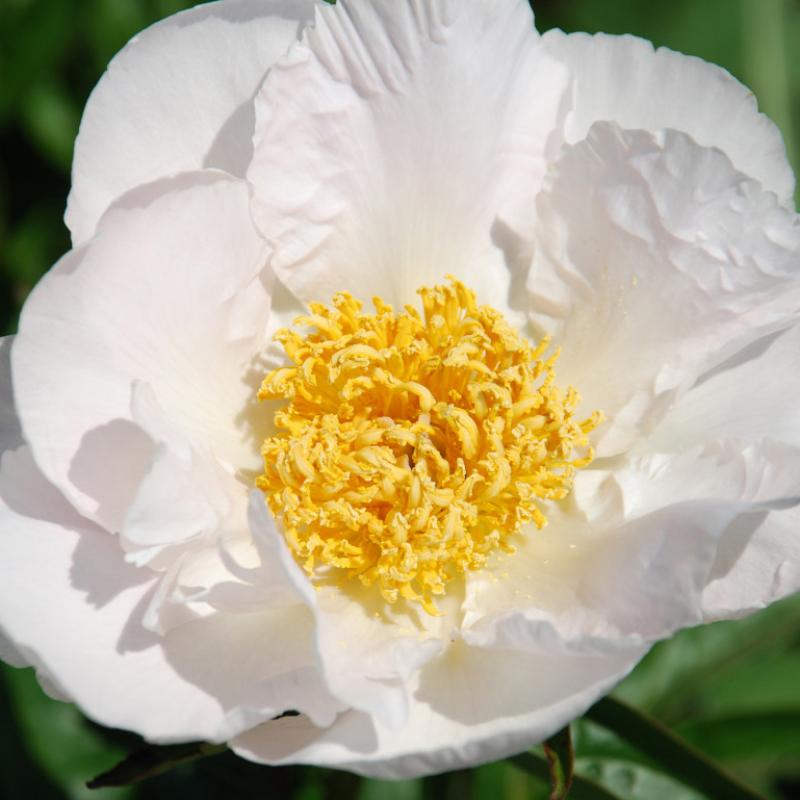 'Sunburst' is a Japanese Peony with blooms that consist of glistening double white petals around a yellow center. This is a long lived, salt tolerant and deer resistant selection.