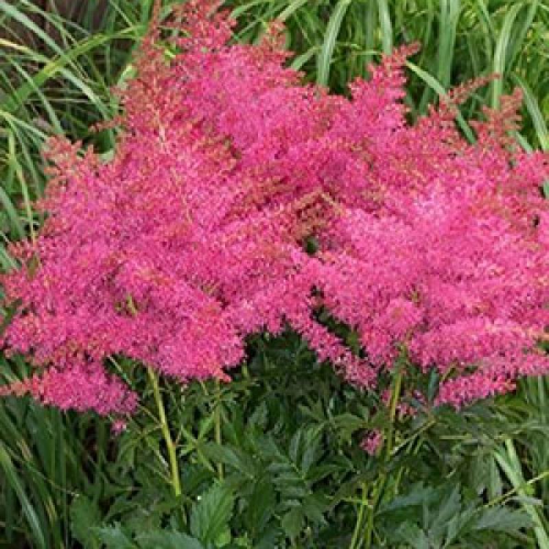 This compact plant sports fluffy plumes of deep cerise-pink in July amid tidy, attractive mounds of glossy, deep green, ferny foliage.