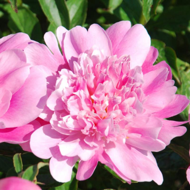 'Heidi' features soft pink, semi-double, mildly fragrant flowers with fluffy raised centers on sturdy stems. A compact plant, it forms robust clumps of deep green, glossy foliage.