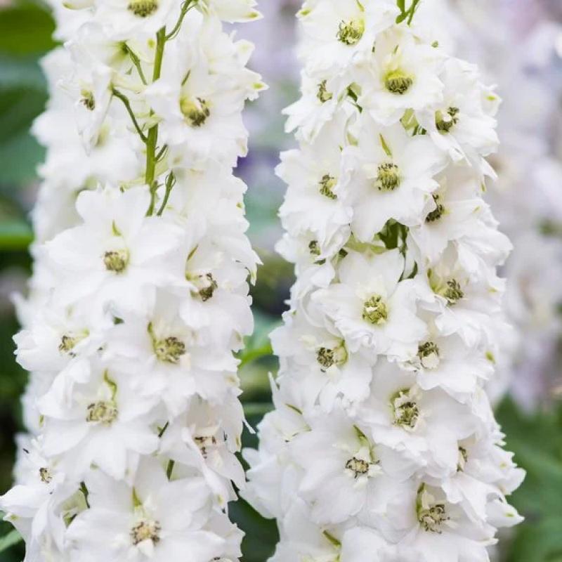 Compact and sturdy, this delphinium produces elegant spires of pure white blooms in early to midsummer. The shorter habit makes it more resistant to wind and easier to grow in smaller gardens. A showy, long-lasting choice for borders, cutting gardens, and pollinator plantings.